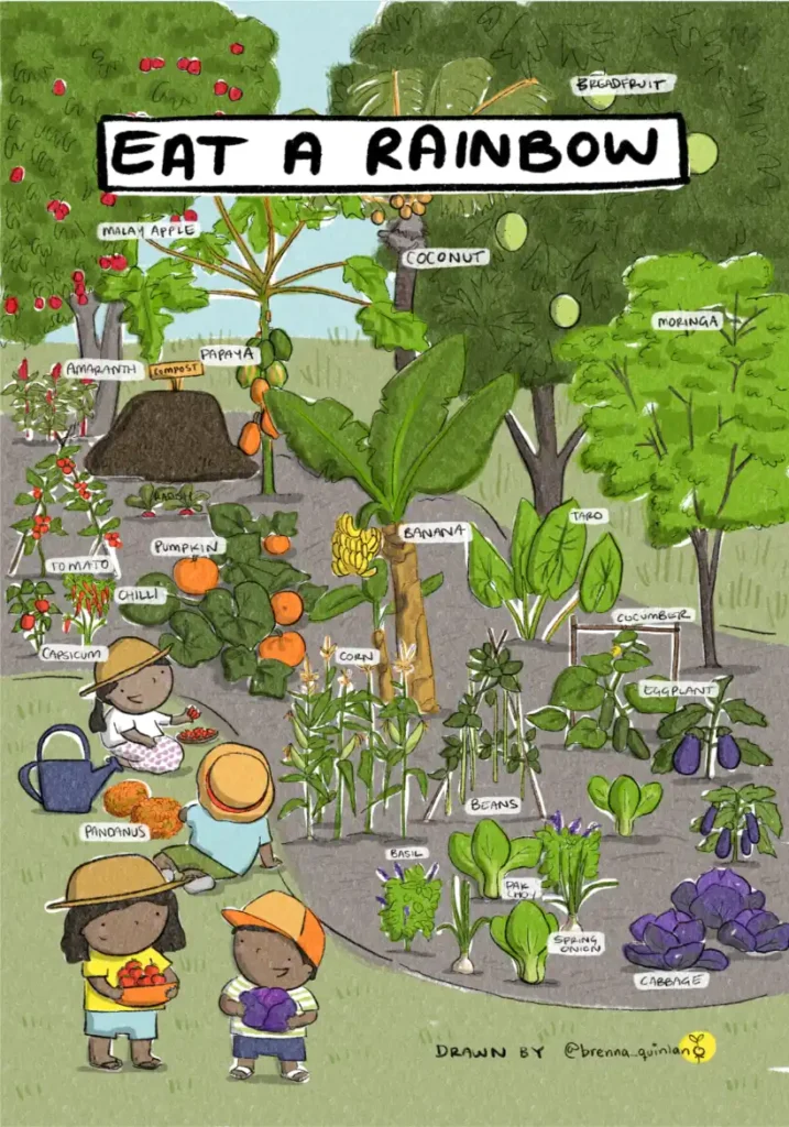 We danced and we sang to the mantra of ‘Eat 5 vegetables, 2 fruit Everyday‘, and ‘Eat a Rainbow‘, with whole school communities of 100’s of students. I was over the moon when Brenna agreed to create RMI specific posters which we integrated into the cookbook and printed as A3 posters for schools.